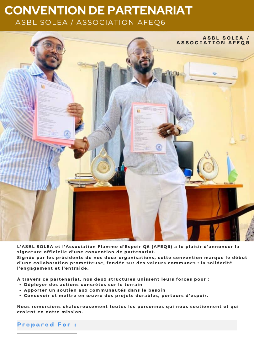Vous êtes une ASBL, une association, une organisation ou une ONG et souhaitez soutenir notre cause ? Nous sommes toujours à la recherche de nouveaux partenariats pour renforcer nos actions. Pour nous contacter, veuillez nous envoyer un courriel à [[email]] ou nous appeler au [[phonenumber]]. Notre processus est simple : une fois votre intérêt manifesté, nous discuterons de nos objectifs communs et des modalités de collaboration. Rejoignez ASBL SOLIDARITÉ EST-AFRIQUE ( SOLEA ) et faisons la différence ensemble.